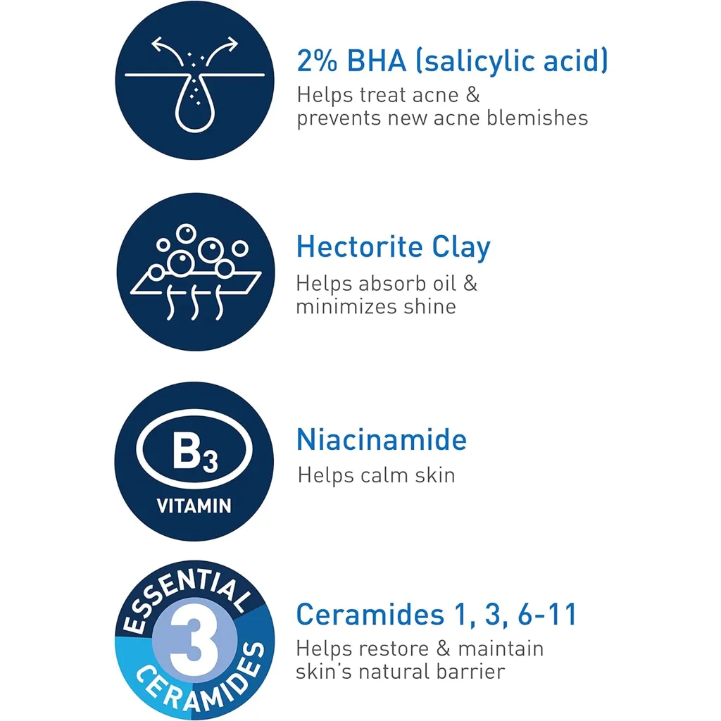 Developed with dermatologists, a gel-to-foam cleanser with 2% salicylic acid and purifying clay to remove dirt & excess oil, clean pores, gently exfoliate, and deeply reduce oiliness while helping to not disrupt the protective skin barrier or cause dryness and discomfort with 3 essential ceramides. Featuring Oil-Absorbing Technology to minimize visible shine. Formulated to clear acne, reduce blackheads, and improve the appearance of pores.?Non-Comedogenic?Paraben-free?Fragrance-free?Allergy testedKey Ingredients:?2% Salicylic acid: Treats acne and penetrates pores to help prevent new breakouts?Hectorite clay: Helps absorb oil and helps skin look less shiny?Ceramides: Essential for healthy skin, ceramides help restore and maintain the skin?s natural barrier?Niacinamide: Helps calm the skin