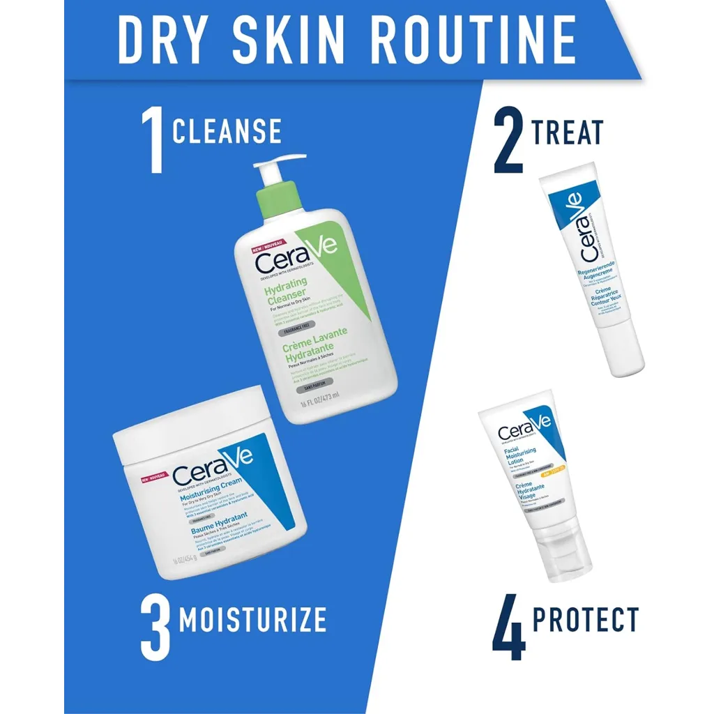 Developed with dermatologists, CeraVe Moisturizing Cream has a unique formula that provides 48-hour hydration and helps restore the protective skin barrier with three essential ceramides (1,3,6-II) and hyaluronic acid. This rich, non-greasy, fast-absorbing formula is ideal for sensitive skin on both the face and body Featuring our patented MVE Technology to release a steady stream of moisturizing ingredients throughout the day and night. ?Non-comedogenic ?Fragrance-free ?Oil-free ?Hypoallergenic ?Gentle, non-irritating formula ?Suitable for sensitive skin Key Ingredients: ?MVE Technology: This patented delivery system continually releases moisturizing ingredients for 24-hour hydration ?Ceramides: Essential for healthy skin, ceramides help restore and maintain the skin?s natural barrier ?Hyaluronic Acid: This ingredient attracts hydration to the skin?s surface and helps the skin retain moisture