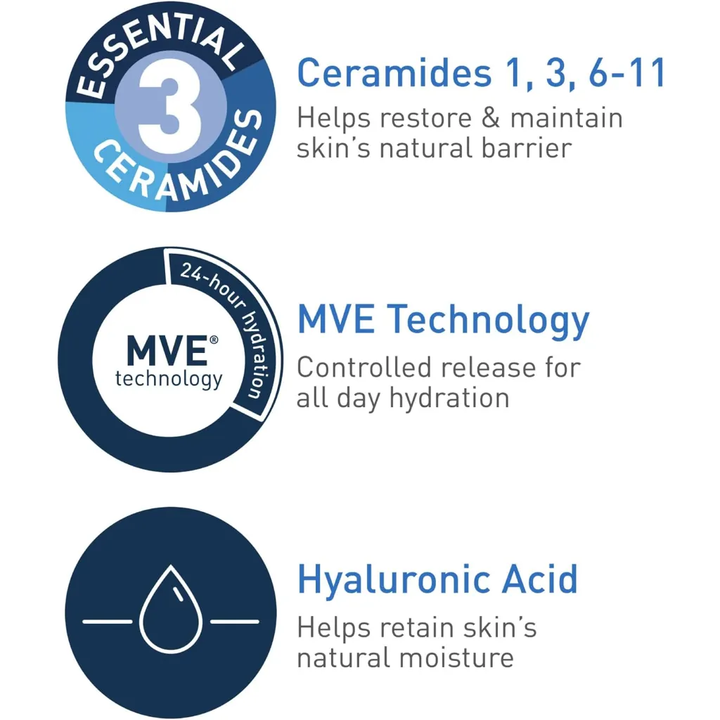 • [ HYDRATES AND RESTORES ] Hyaluronic acid moisturizer with ceramides and MVE technology. Rich, velvety texture that leaves skin feeling smooth, it is absorbed quickly for softened skin without greasy, sticky, feel.