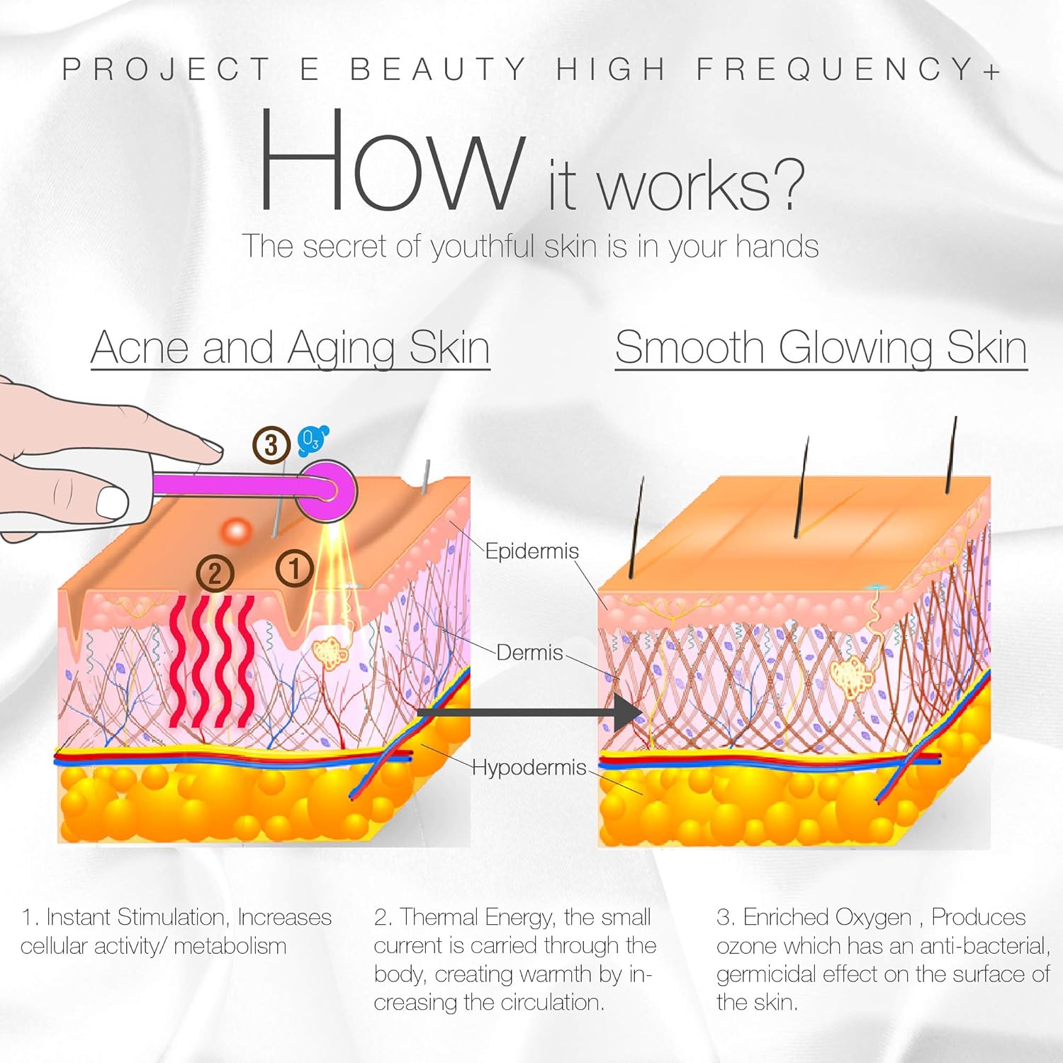 - KEY BENEFITS This high frequency device can quietly reverse aging process and bring back youthful skin accelerates blood circulation collagen and cell production to improve and reduce age spots wrinkles sagging skin drastically improve aging skin serves well for skin whitening and tightening eliminate acne pimples help wound to heal fast restrain pores tighten up the skin help hair growth and cure alopecia etc